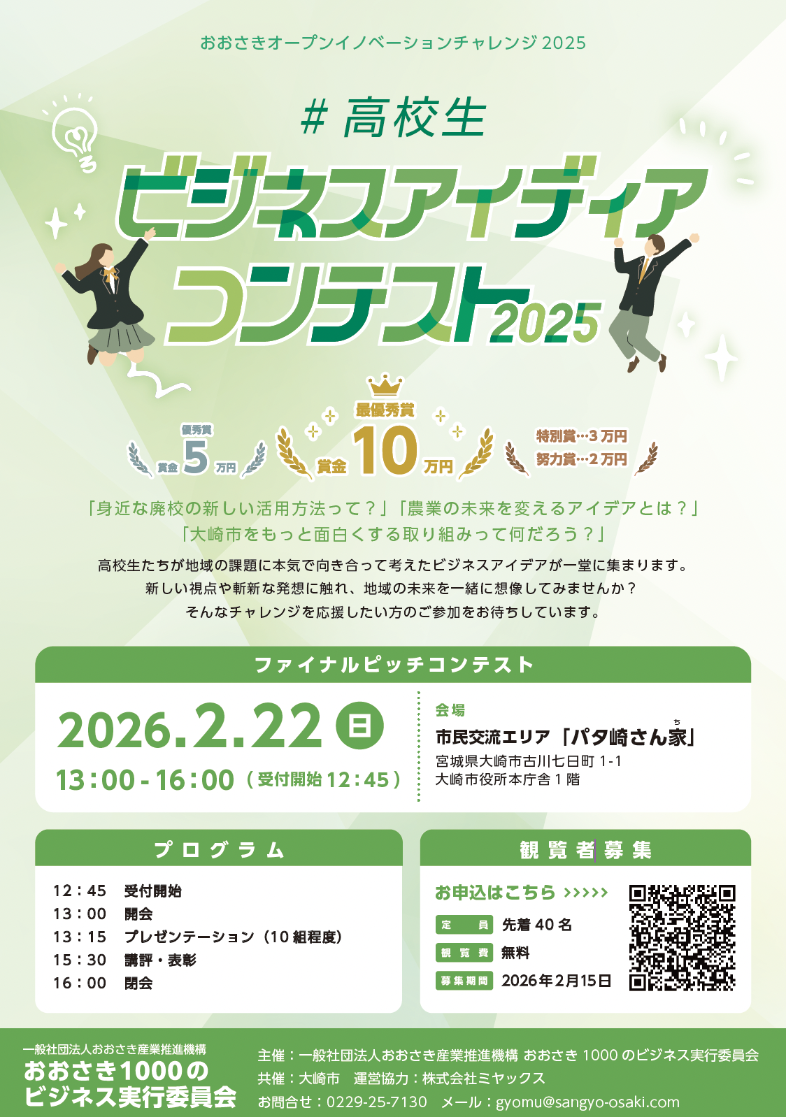 本コンテストでは、「10年以内に大崎市から上場企業を輩出する」という明確な目標を掲げており、これにより地域の経済基盤の強化とブランド力の向上が期待されています。未来を担う子どもたちが「大崎市に住み続けたい」「大崎市で起業したい」と心から思えるような、魅力あるプランの誕生を心より願っております。